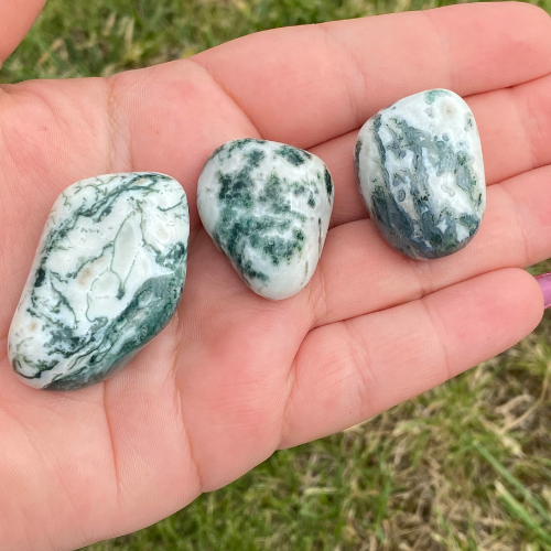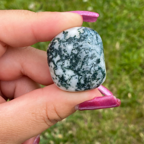 L’agate mousse présente une palette de couleurs qui inclut le blanc, le vert foncé et le vert clair. Ces nuances créent un motif distinctif semblable à des mousses végétales, d’où son nom. Cette pierre est rattachée au chakra du cœur.