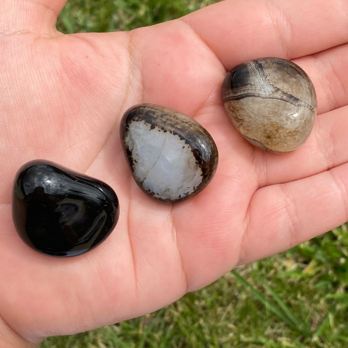 Souvent associée au chakra racine, l’agate noire, par son éclat ténébreux et profond, est une pierre envoûtante.