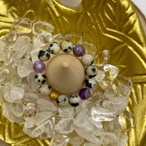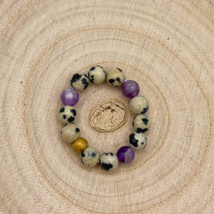 La combinaison harmonieuse de l’améthyste et du jaspe dalmatien offre un équilibre unique de propriétés bienfaisantes pour le corps, l’esprit et l’âme. L’améthyste, avec sa teinte violette apaisante, est reconnue depuis des siècles pour ses pouvoirs de purification et de protection, favorisant la clarté mentale et la sérénité émotionnelle. De son côté, le jaspe dalmatien, orné de taches noires sur un fond crème, incarne l’énergie terrestre et la connexion à la nature. Il apporte vitalité et stabilité, stimulant la confiance en soi et encourageant à vivre pleinement le moment présent. Ensemble, ces deux pierres forment une alliance puissante, offrant à celui qui les porte une voie vers l’équilibre intérieur, la force intérieure et la croissance spirituelle.