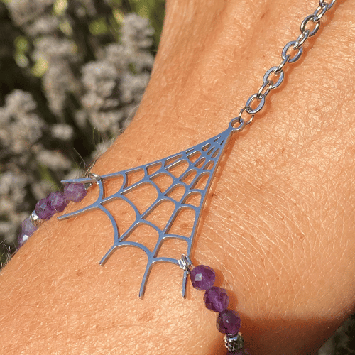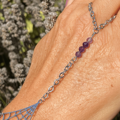 Élégant et mystérieux, ce bijou de main en améthyste facettée et sa toile d’araignée entourera ta tenue d’une aura enchantée. 💜🕸️