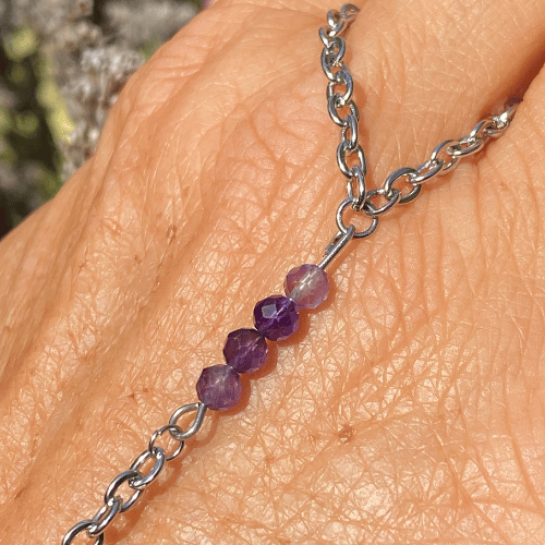 • Matériaux : perles d’améthyste, fermoir et breloque argent en acier inoxydable, chaine argent en acier inoxydable
