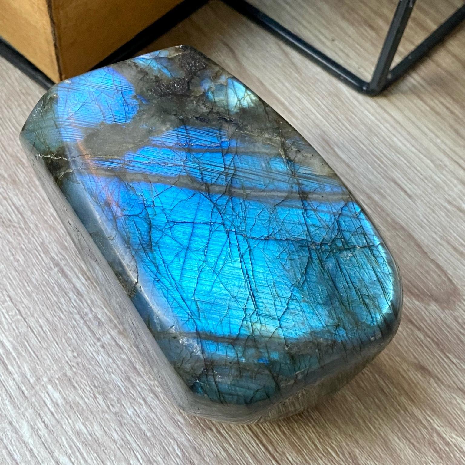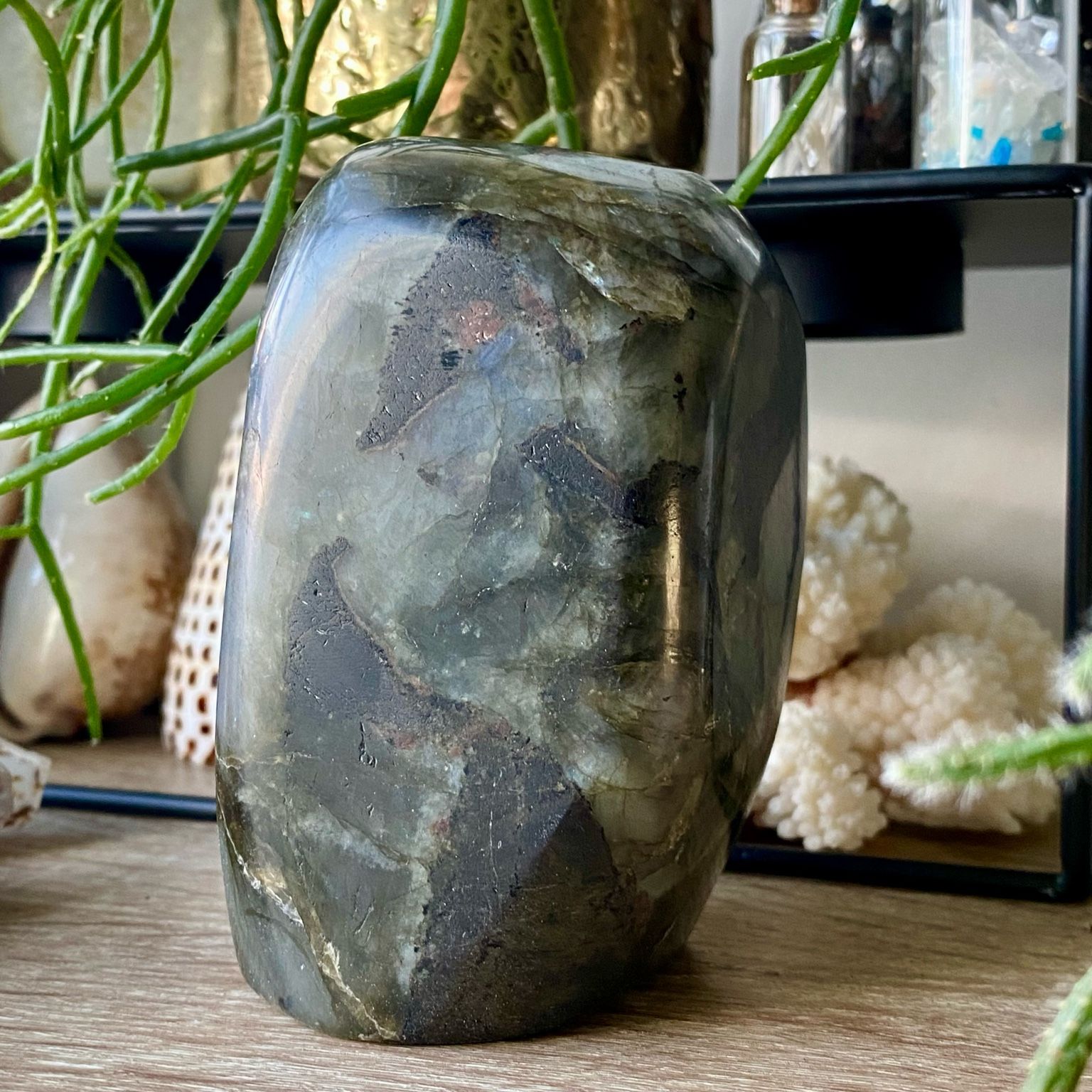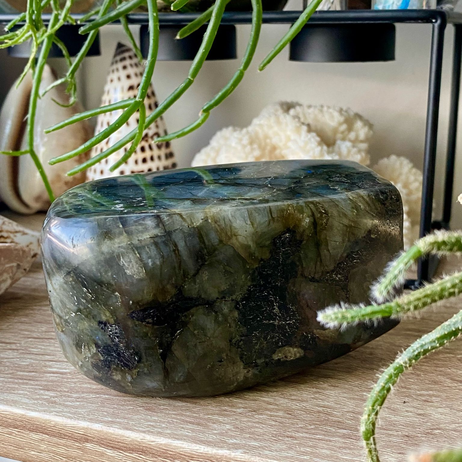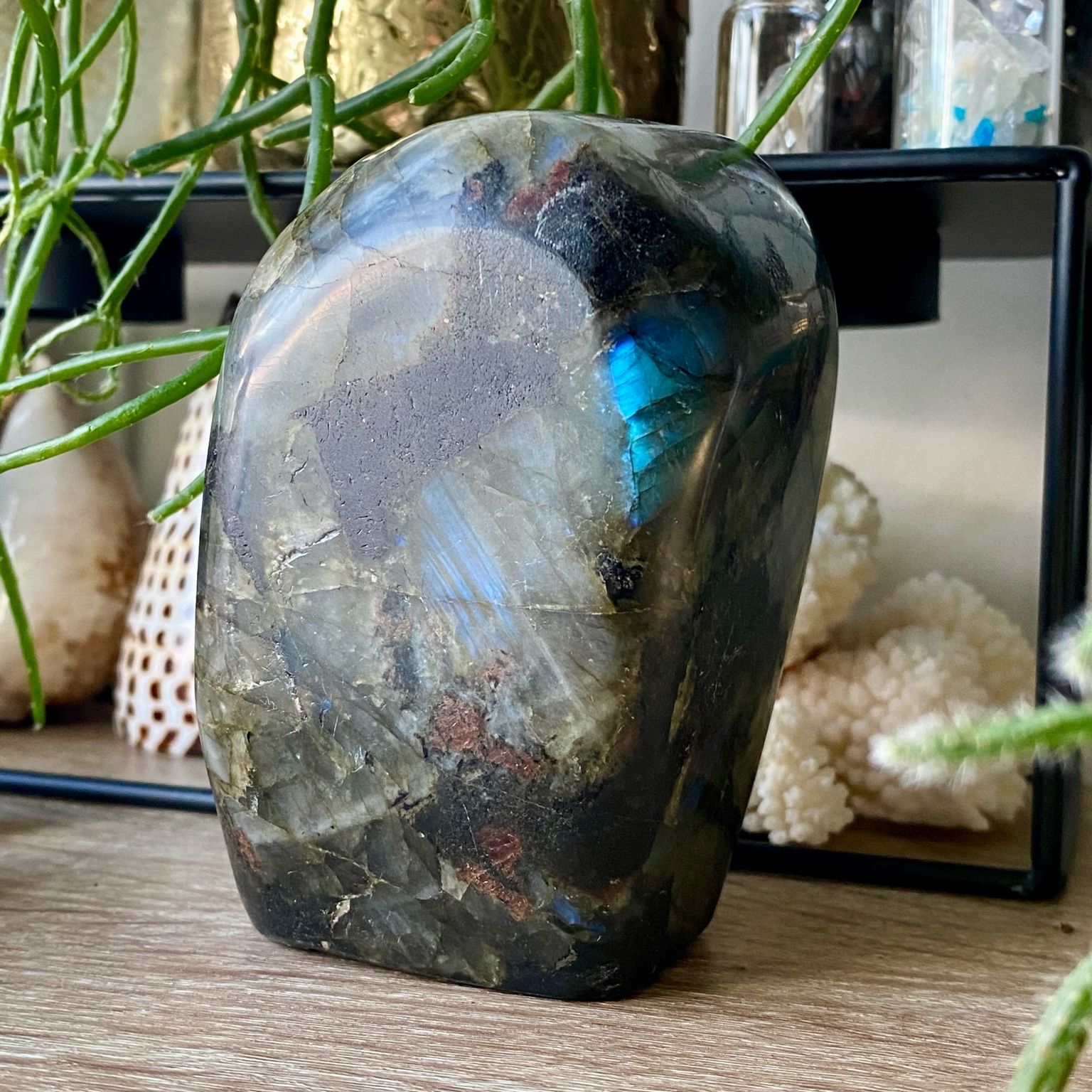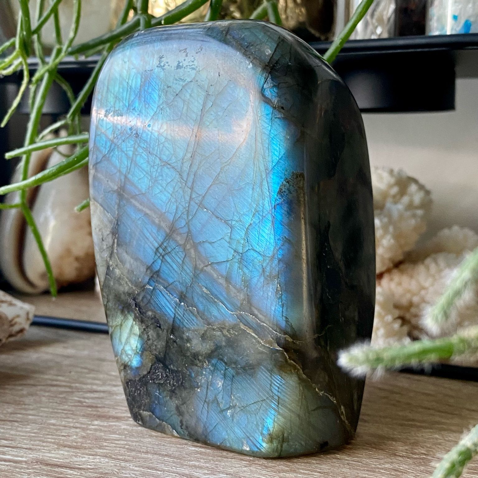 Ce bloc de labradorite aux reflets bleus, est une pièce puissante de protection et d’intuition, à la présence magnétique.