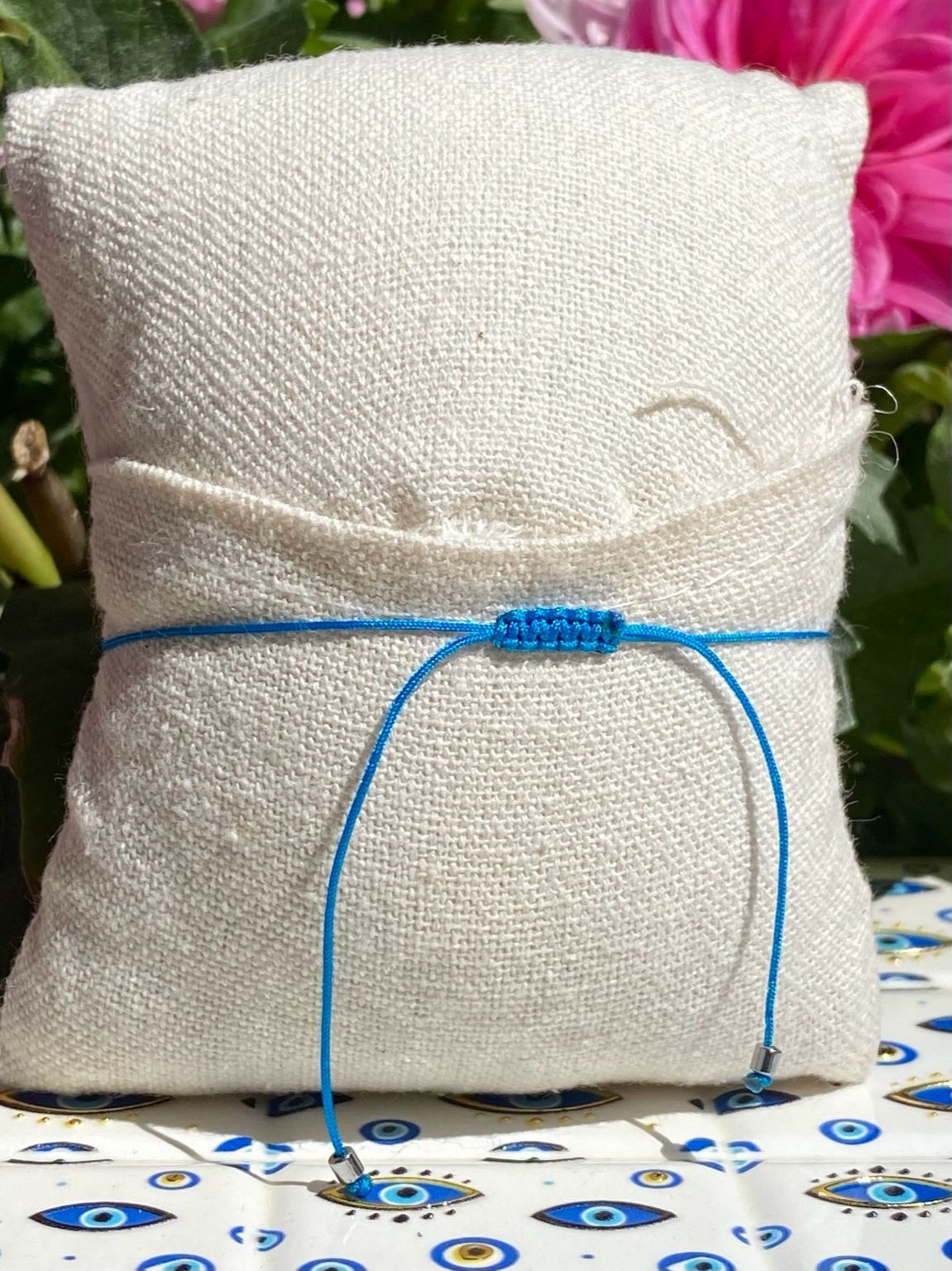 • Type : bracelet réglable sur fil de jade (nylon) bleu, nœud coulissant