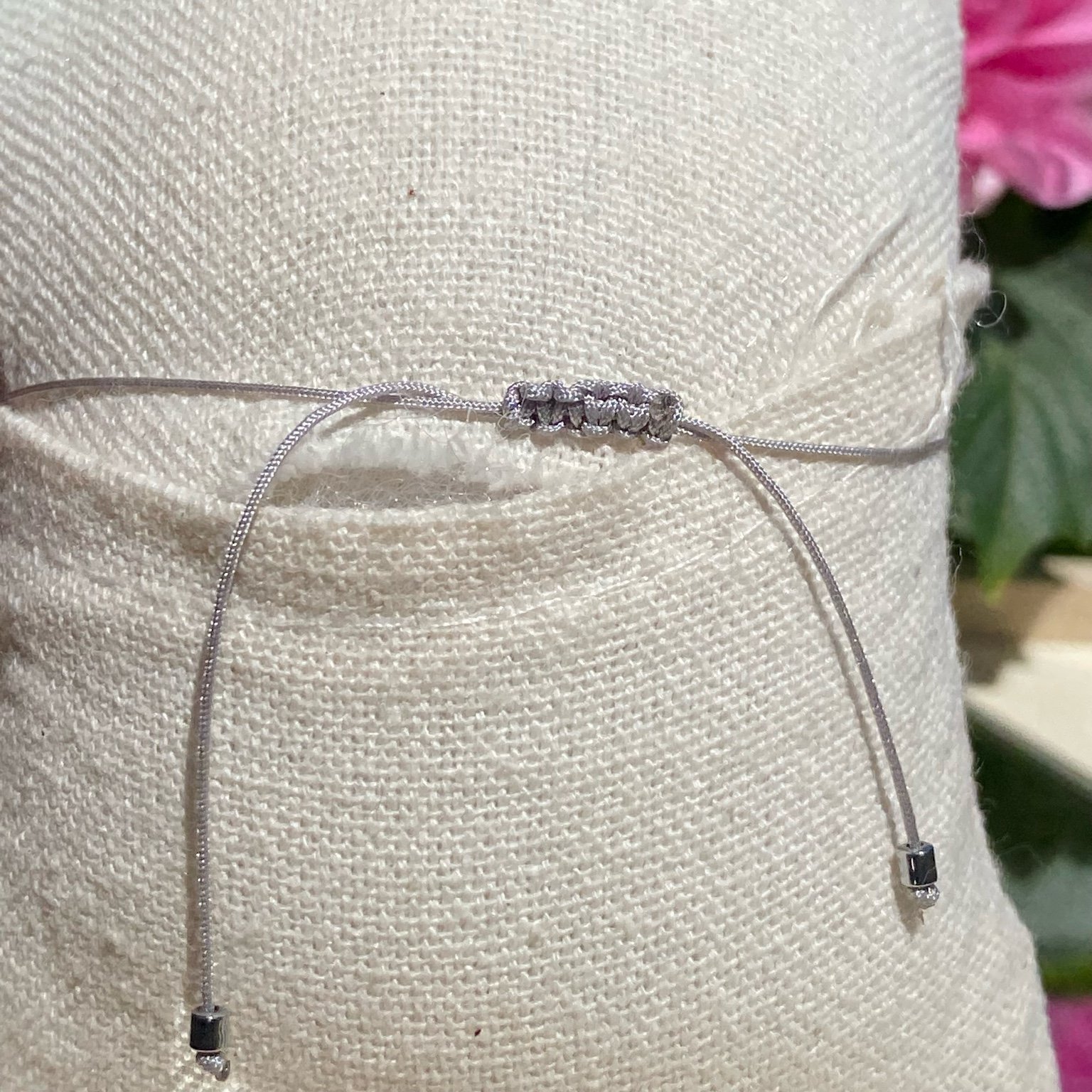 • Type : bracelet réglable sur fil de jade (nylon) gris, nœud coulissant