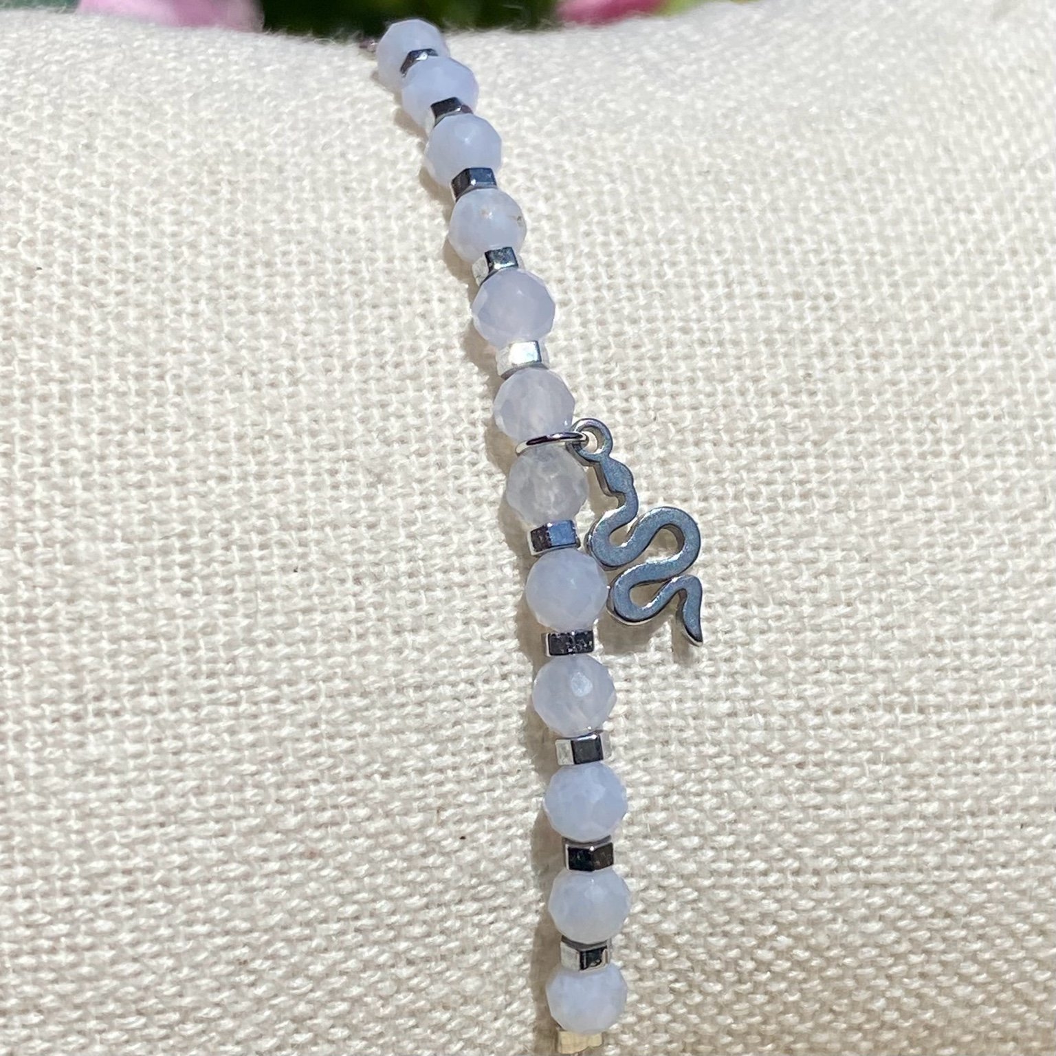 Ce bracelet en calcédoine bleue, entièrement monté à la main, associe la douceur de la pierre à la puissance symbolique du serpent.La breloque serpent, en acier inoxydable argenté, représente le changement, la régénération et la guérison. Porter ce bracelet, c’est affirmer son évolution avec grâce.