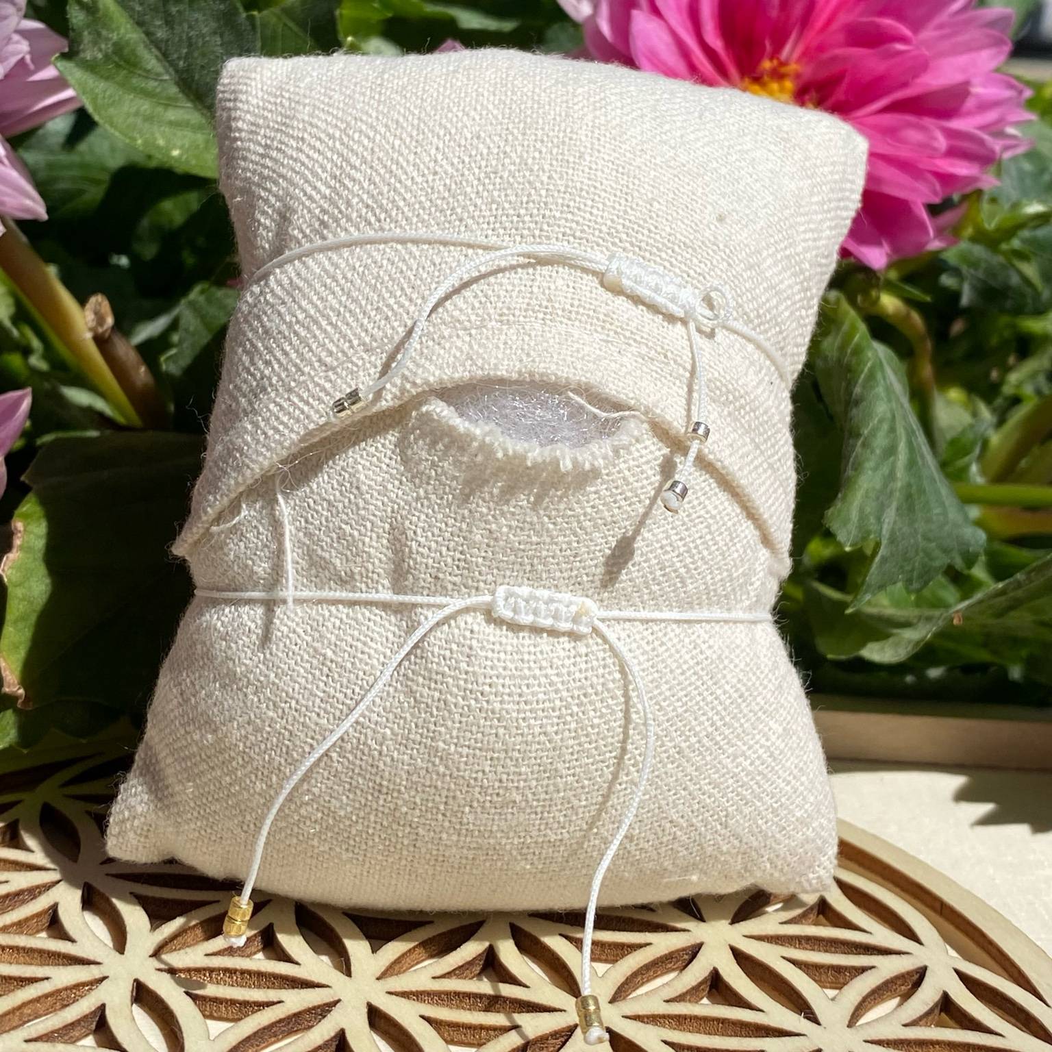 Laisse-toi envoûter par ce bracelet bohème et lumineux, mettant en valeur un sublime œil de Sainte-Lucie monté sur un fil de jade blanc, orné de perles métalliques dorées ou argentées (au choix). Un bijou doux, à porter seul ou à accumuler, comme un talisman d’été.