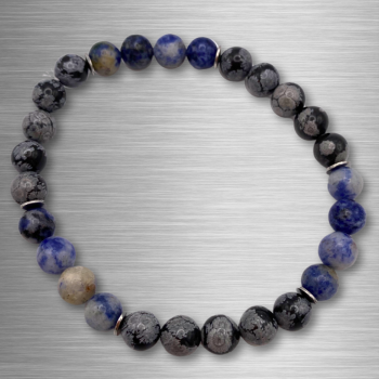 Bracelet composé d’obsidienne flocons de neige et de sodalite, embellit par les nuances argentées de l’acier inoxydable.