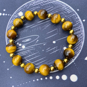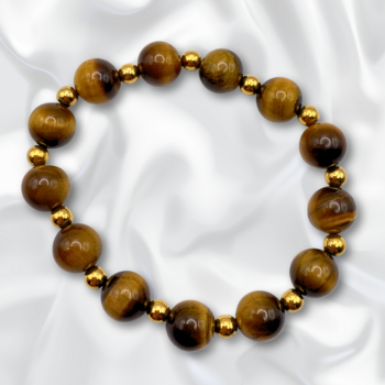 Bracelet composé d’œil de tigre, embellit de perles dorées en acier inoxydable.