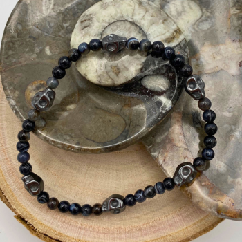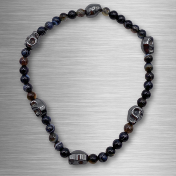 Bracelet composé d’agate noire et d’hématite, taillée en forme de crâne.