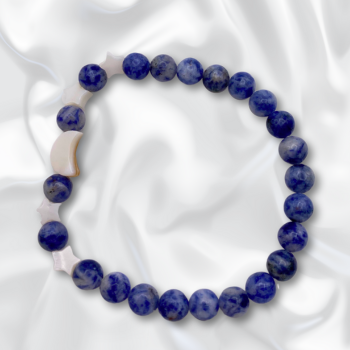 Ce magnifique bracelet est composé de perles de nacre et de sodalite, cette combinaison offre un équilibre entre la douceur apaisante de la nacre et la clarté communicative de la sodalite, créant ainsi un bracelet qui favorise la paix intérieure et l’expression authentique de soi.