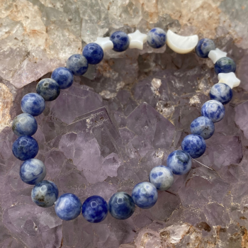 Bracelet composé de sodalite, accompagné par ses perles de nacre taillées en forme de lune et d’étoiles.