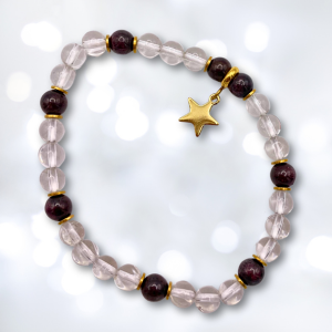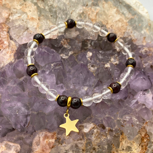 • Matériaux : perles de cristal de roche et de grenat, perles dorés et breloque étoile en acier inoxydable