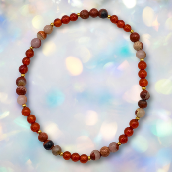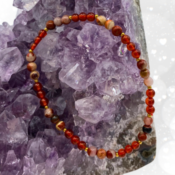 Ce magnifique bracelet est composé de cornaline et de jaspe rouge, une combinaison de pierres qui stimule la vitalité et la passion tout en apportant force et ancrage.