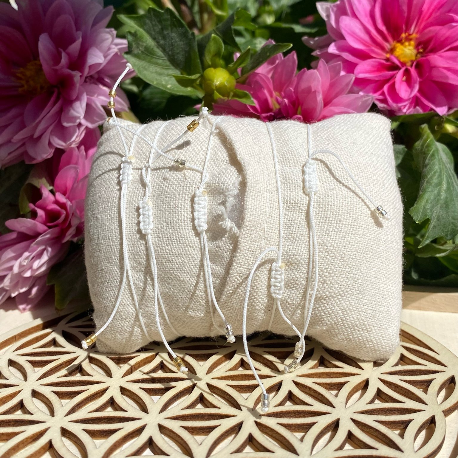 • Type : bracelet réglable sur fil de jade (nylon) blanc, nœud coulissant