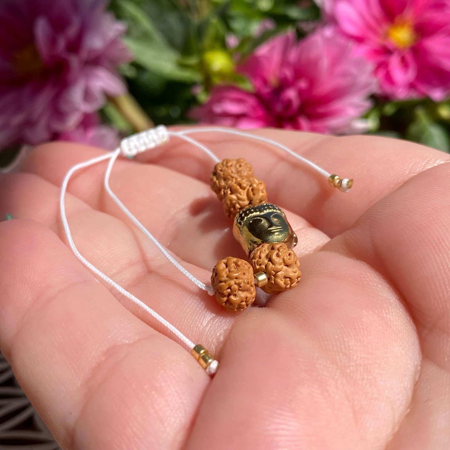 Chaque bracelet est monté à la main avec un cordon blanc ajustable, 5 versions sont disponibles selon la couleur de la tête de Bouddha en hématite : noir argenté, argenté foncé, argenté éclatant, doré éclatant, doré comme l’or.
