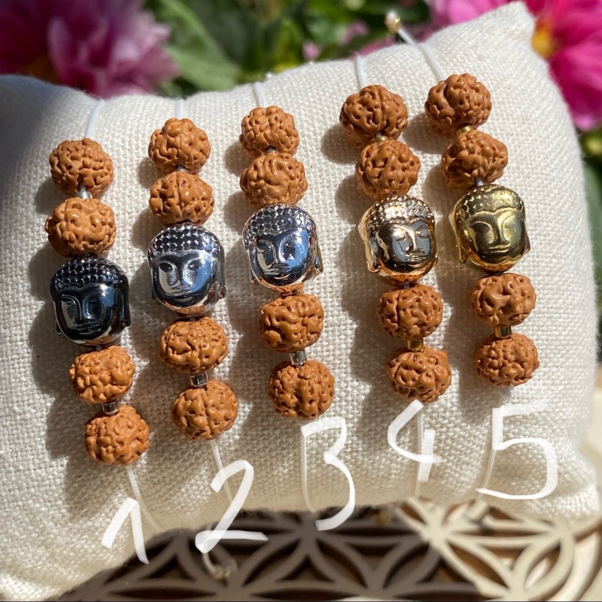 Bracelet composé de perles de larmes de Shiva naturelles, appelées aussi graines de rudraksha et d’une tête de Bouddha en hématite, décliné en 5 modèles.