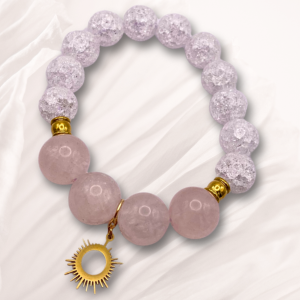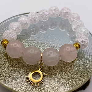 • Matériaux : perles de cristal de roche craquelé et de quartz rose, perles dorés et breloque soleil en acier inoxydable