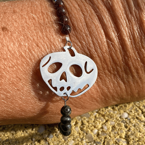 Sombre et envoûtant, ce bracelet en grenat et jaspe kambaba est rehaussé d’une pomme empoisonnée, hommage à la légende de Blanche-Neige. 🍏✨