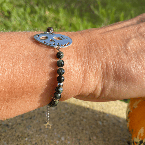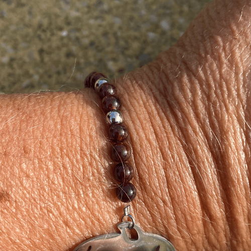 Le mélange unique des pierres, combiné à cette breloque symbolique, crée un bracelet qui raconte une histoire puissante et mystérieuse, ajoutant une touche de magie à ta tenue.