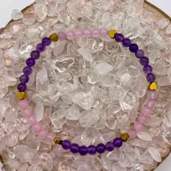 La combinaison de l’améthyste et du quartz rose offre un équilibre harmonieux entre la spiritualité et l’amour inconditionnel. L’améthyste, avec ses propriétés apaisantes et protectrices, favorise la clarté mentale et le bien-être spirituel, aidant à dissiper le stress et les pensées négatives. De son côté, le quartz rose, pierre de l’amour et de la compassion, apporte une énergie douce et réconfortante qui ouvre le cœur à l’amour-propre et à l’empathie envers les autres. Ensemble, ces deux pierres créent une synergie puissante qui favorise l’harmonie émotionnelle, renforçant la connexion avec soi-même et les autres tout en cultivant un sentiment de paix intérieure et d’équilibre.