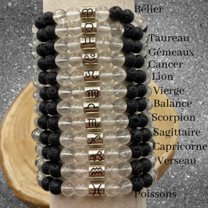 Ce magnifique bracelet est composé de cristal de roche et de pierre de lave, embellit d’une perle représentant votre signe astrologique, pour une connexion personnelle et un style authentique.