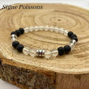 Bracelet composé de cristal de roche et pierre de lave rehaussé d’une perle représentant votre signe astrologique.