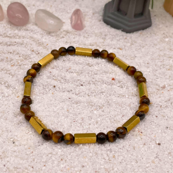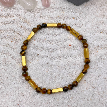 Bracelet composé d’œil de tigre, embellit de perles dorées en acier inoxydable.