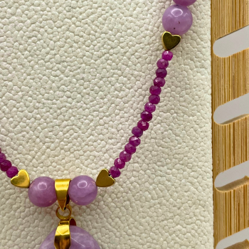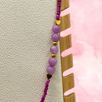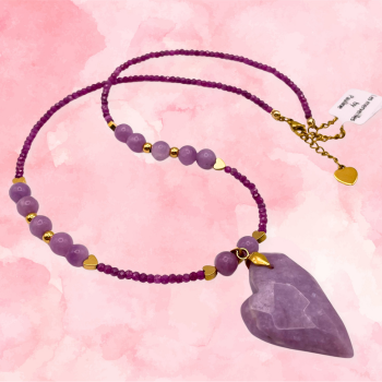 Chaque perle de rubis scintille avec une intensité ardente, capturant la lumière dans ses nuances roses profondes et vibrantes, évoquant la vitalité et la force intérieure. Ces perles, accompagnées de perles or rondes et en forme de cœur, ajoutent une touche de tendresse. Au centre du collier se trouve un pendentif en forme de cœur en lépidolite, symbole d’amour et de compassion. Sa douce couleur lavande offre un contraste saisissant avec la lumière flamboyante des perles de rubis, créant un équilibre harmonieux entre passion et paix intérieure. Ce pendentif évoque la tendresse et la douceur du cœur, invitant à ouvrir son cœur à l’amour inconditionnel et à la compassion.