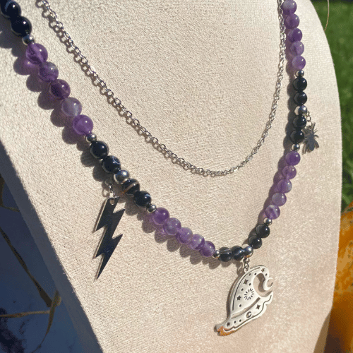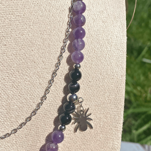 Succombez aux charmes de ce collier envoûtant, mêlant l’énergie apaisante de l’améthyste et la puissance protectrice de l’agate noire. Avec ses breloques intrigantes – un chapeau de sorcière pour la magie, une araignée pour l’audace, et un éclair pour un éclat saisissant – ce bijou est le complice idéal pour celles et ceux qui aiment jouer avec l’inconnu. Parfait pour ajouter une touche de mystère à votre style ! 🖤⚡🕷️