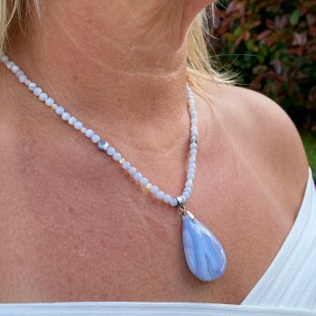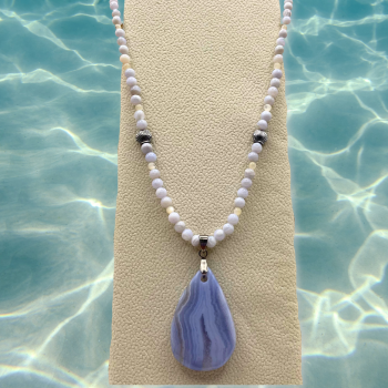 • Matériaux : perles de calcédoine bleue et de nacre, pendentif en calcédoine bleue en forme de goutte avec bélière en acier inoxydable, perles coquille saint-jacques et fermoir argent en acier inoxydable