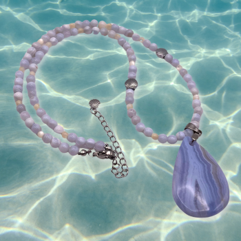 Ensemble, la calcédoine bleue et la nacre créent une combinaison puissante, qui favorise la communication sincère, l’expression de soi authentique et l’harmonie intérieure.