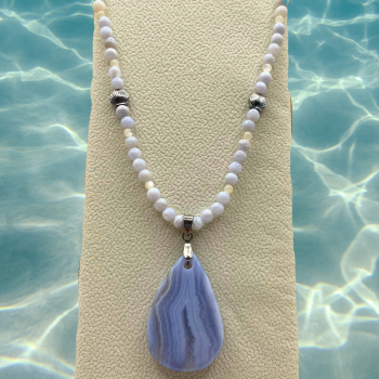 Ce collier en calcédoine bleue et en nacre, embellit par son pendentif en forme de goutte et ses perles en forme de coquille saint-jacques, incarne la beauté et la puissance de l’océan, tout en offrant à celle qui le porte une connexion profonde avec la nature et ses merveilles.