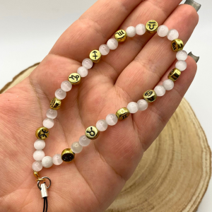 • Matériaux : perles en plastique imitation sélénite, accessoires en métal, perles signes astro or en plastique
