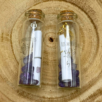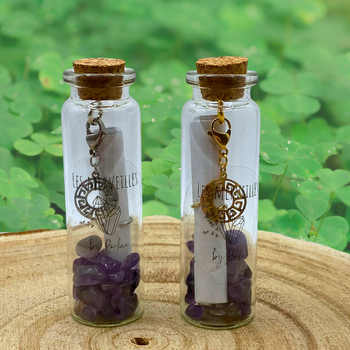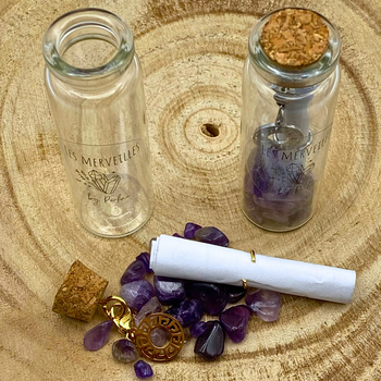 • Contient : 1 fiole en verre, un pendentif en acier inoxydable argent ou or, 30 grammes de brisures d’améthyste et un petit parchemin pour y écrire vos souhaits