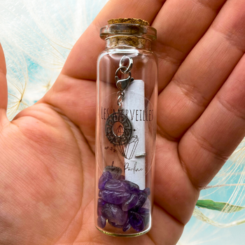 Cette petite fiole en verre renferme des brisures d’améthyste, une pierre ayant des propriétés spirituelles, une capacité à favoriser la clarté mentale et la sérénité Accompagnée d’un pendentif en acier inoxydable, elle offre un réceptacle puissant pour vos souhaits, prêts à se concrétiser…
