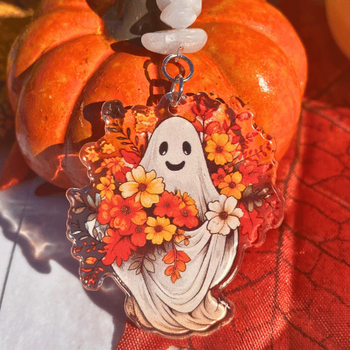 Pars à l’aventure avec ce marque-page en quartz blanc orné d’un doux fantôme entouré de fleurs aux tons orangés. 👻🌸