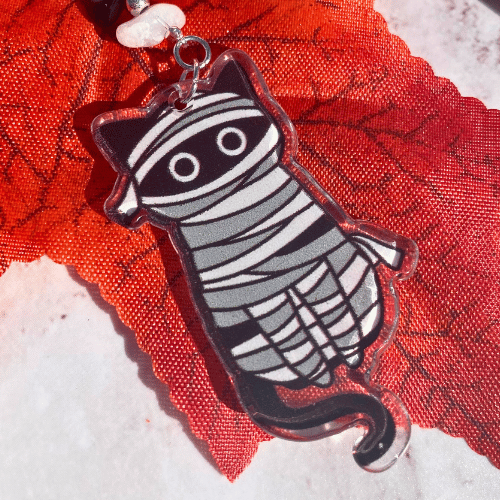 Plonge dans l’ambiance d’Halloween avec ce marque-page en obsidienne noire et quartz blanc, orné d’un chat momifié adorable et mystérieux. 🐱