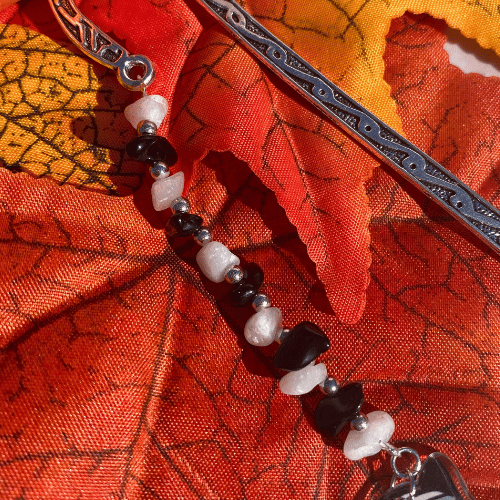 Ce marque-page en obsidienne noire et quartz blanc est une invitation à explorer les profondeurs de l’Égypte ancienne avec une touche d’Halloween !