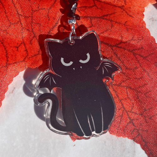 Le pendentif met en scène un adorable chat déguisé en vampire, ailes déployées et canines visibles.