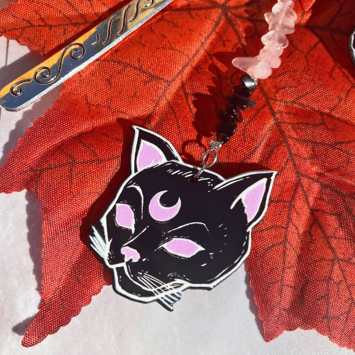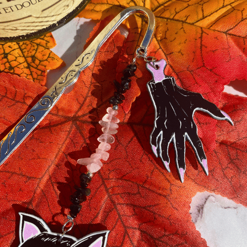 Ajoute une touche terrifiante à tes lectures avec ce marque-page en obsidienne noire et quartz rose, orné d’une main de monstre et d’un chat maléfique. 🐾💀