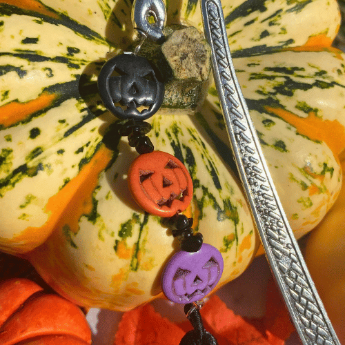 Les perles citrouilles – violette, noire, et orange – ajoutent une touche festive et mystique, tandis que le pompon noir finalise ce bijou de manière élégante.