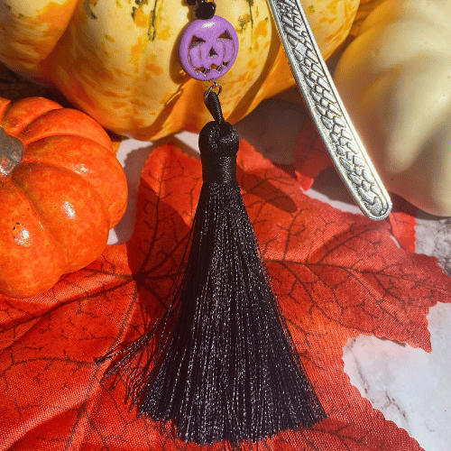 Laisse-toi envoûter par l’esprit d’Halloween avec ce marque-page en obsidienne noire, orné de trois citrouilles et d’un pompon noir. 🎃🖤