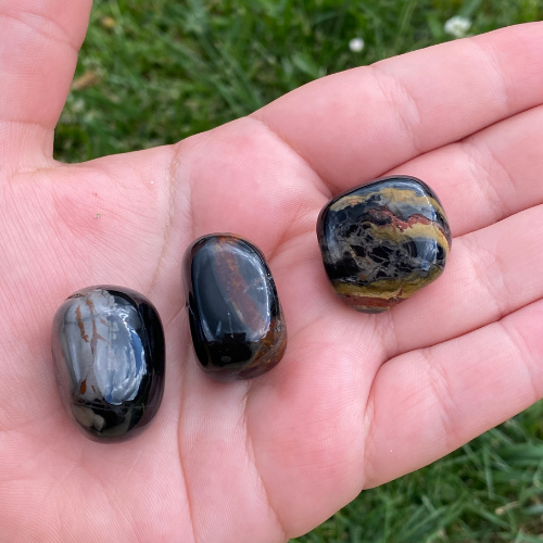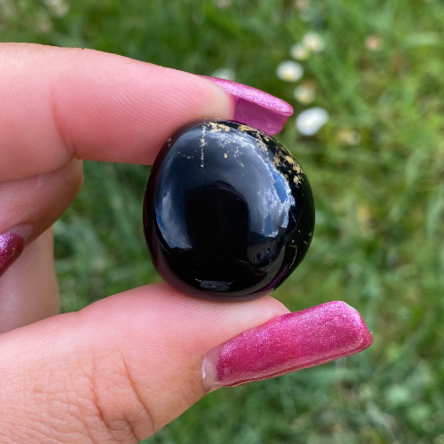 L’onyx est une pierre qui se décline généralement en nuances de noir profond, parfois avec des bandes ou des marbrures blanches, grises ou marron clair. Elle est en lien avec le chakra racine, elle favorise l’enracinement, la stabilité et procure un sentiment de sécurité.