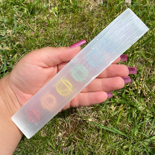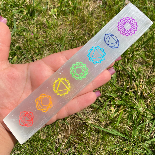 Plaque en sélénite représentant les 7 chakras, la sélénite étant relié au chakra couronne, cette plaque apportera calme intérieur et sérénité.