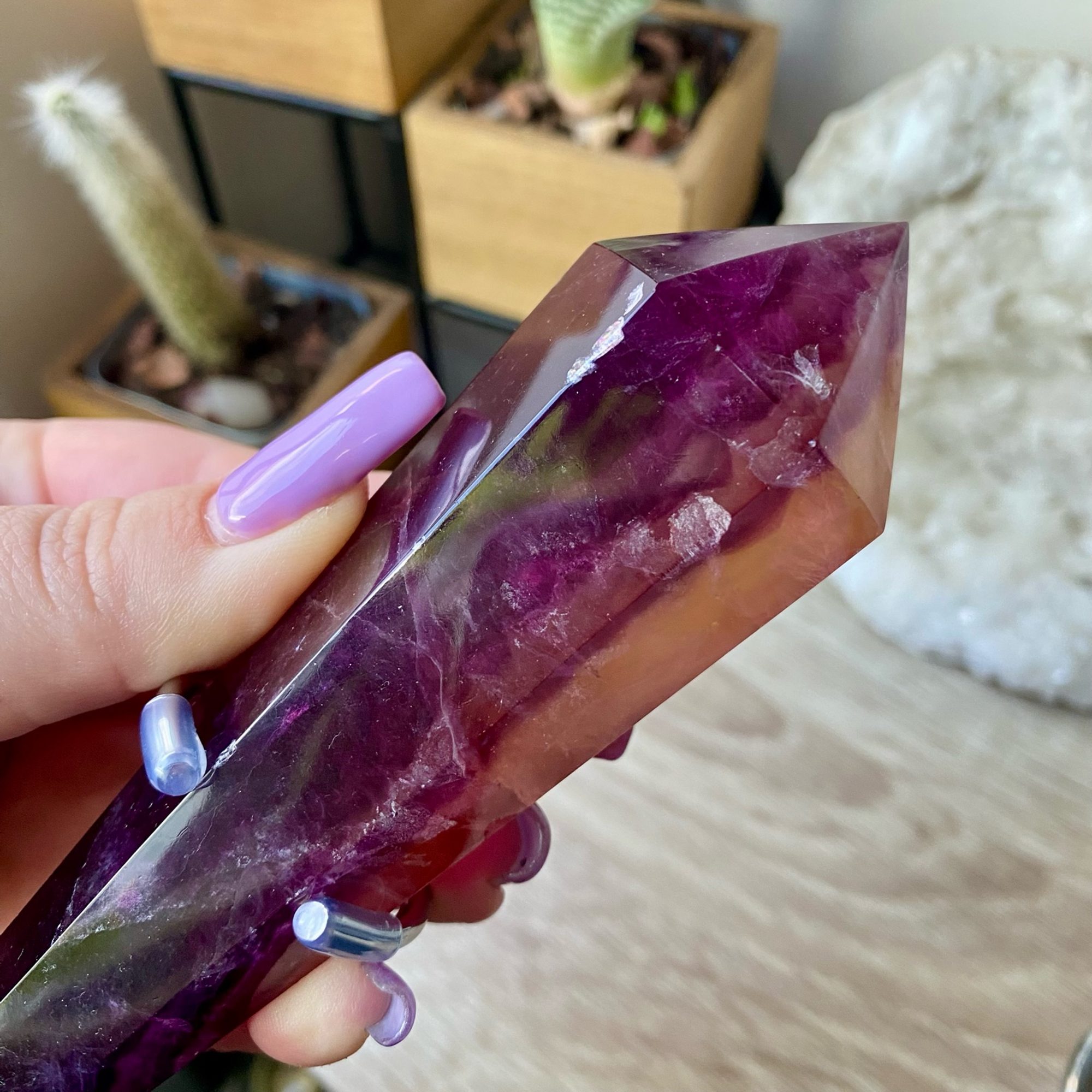 • Énergie douce : la pointe de fluorite agit comme un ancrage énergétique stable.