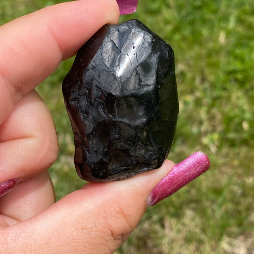 La shungite peut présenter des reflets argentés qui ajoutent une nuance métallique à son apparence noire profonde. Elle est souvent associée au chakra racine.