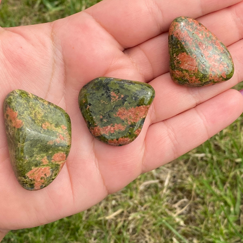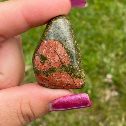 Pierre aux couleurs distinctives qui varient du vert olive au rose avec des inclusions de tons blancs ou crème. L’unakite est principalement associée au chakra du cœur.